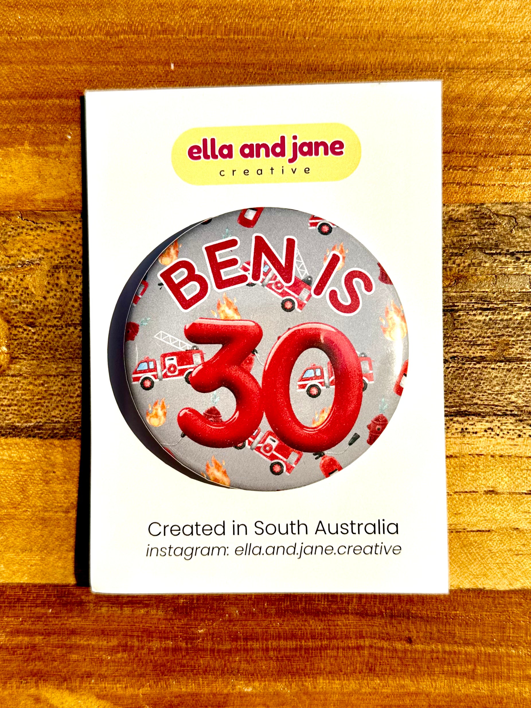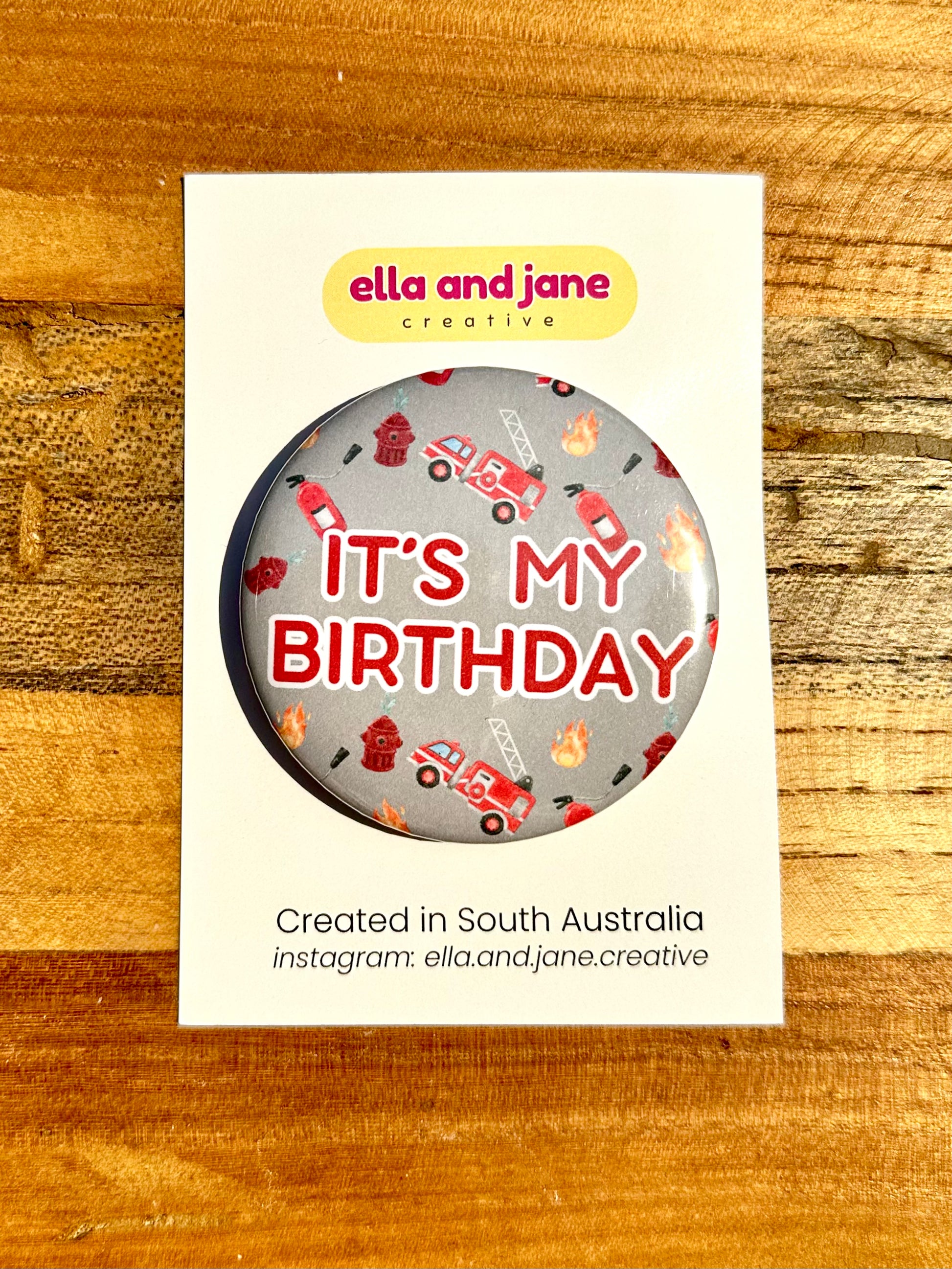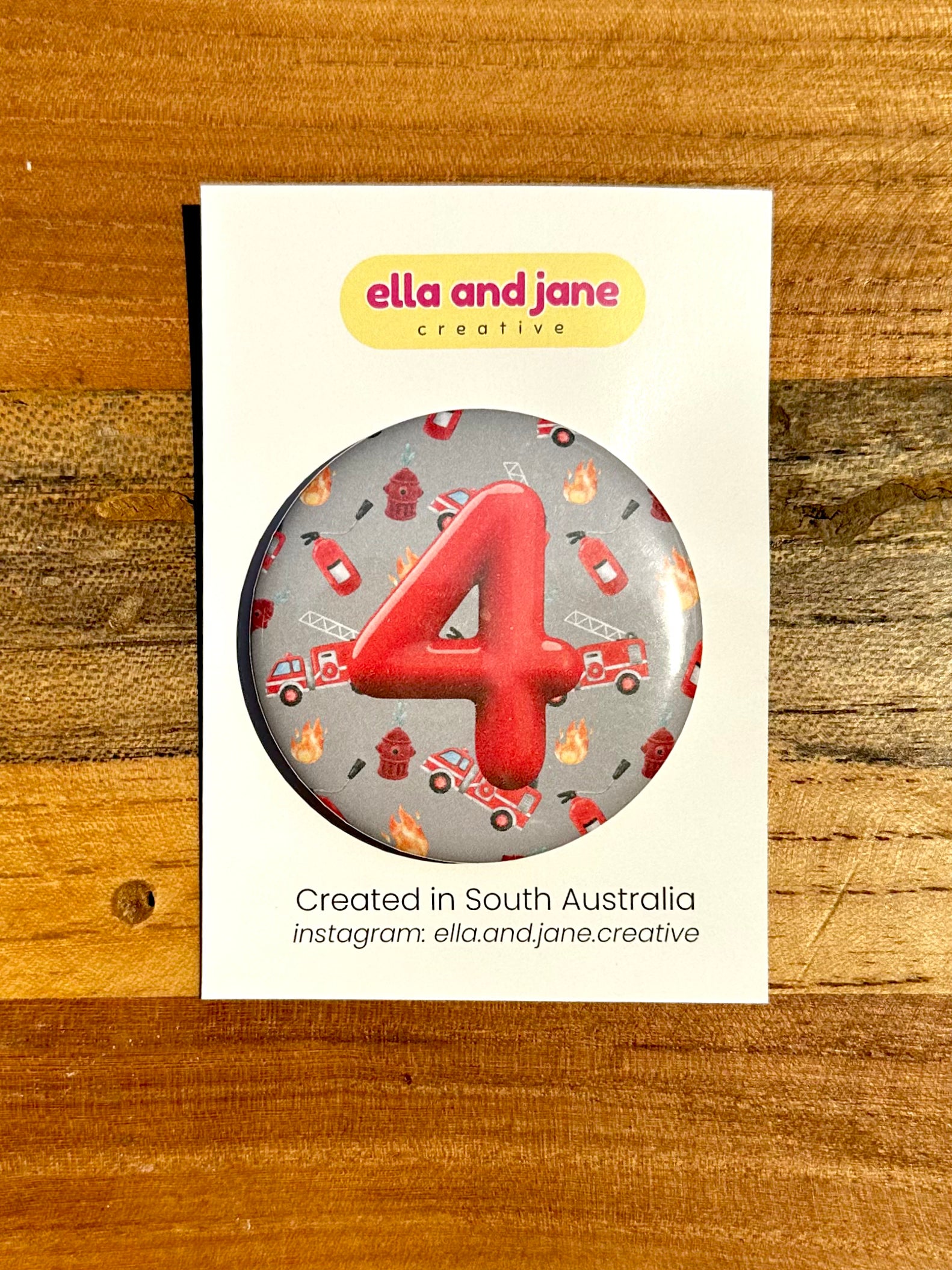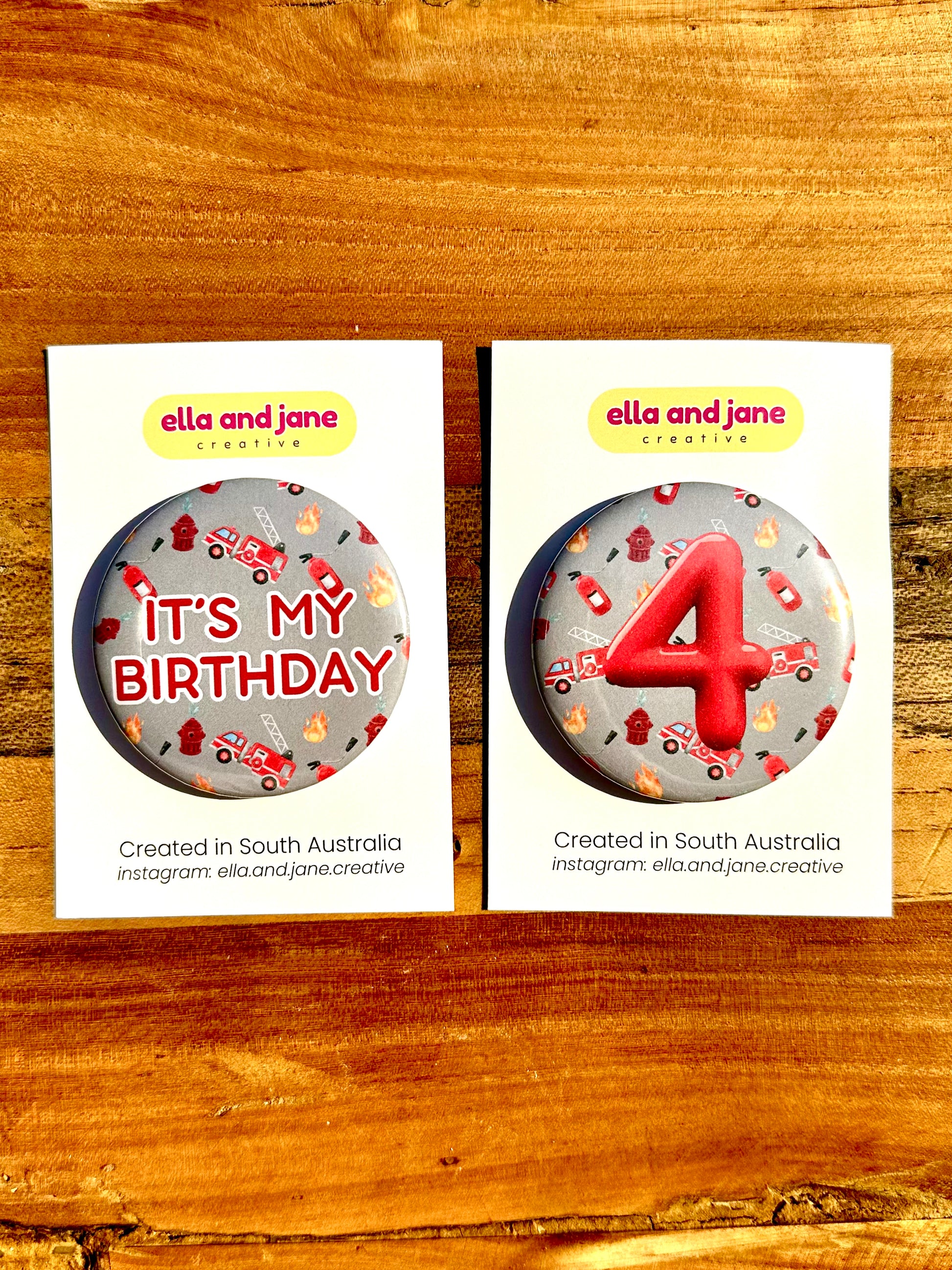 Celebrate a special birthday with this firetruck and flames birthday badge.