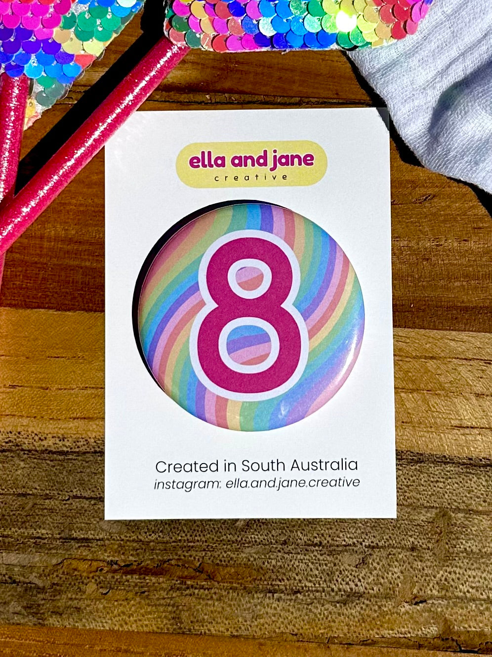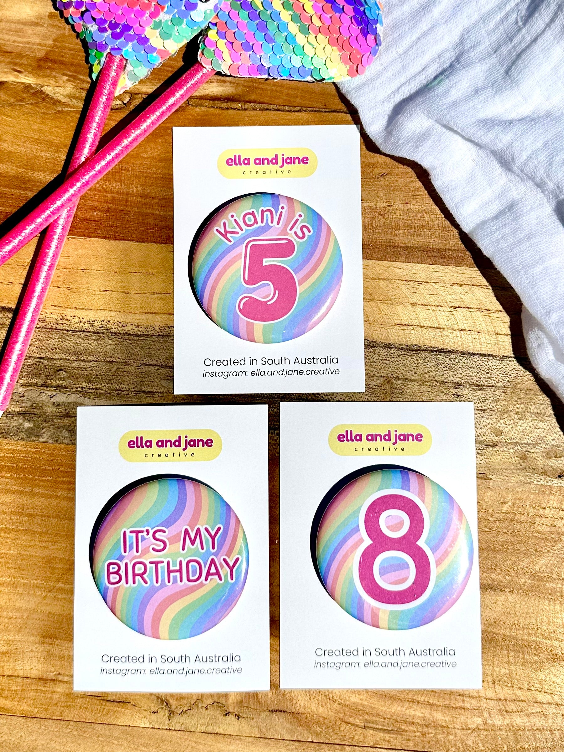 Add some fun and colour to your rainbow birthday with a standard or custom birthday badge.